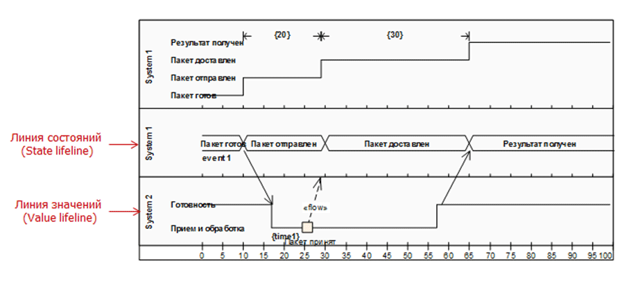 Первый стиль следует предпочесть, когда состояний немного, а второй стиль лучше подходит, когда количество состояний достаточно велико. Временные ограничения записываются в фигурных скобках. Также на временных диаграммах могут быть указаны сообщения, инициирующие переход объекта из одного состояния в другое. Симбиозом диаграммы деятельности и диаграммы последовательности стала диаграмма обзора взаимодействия. |