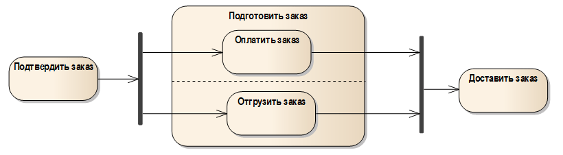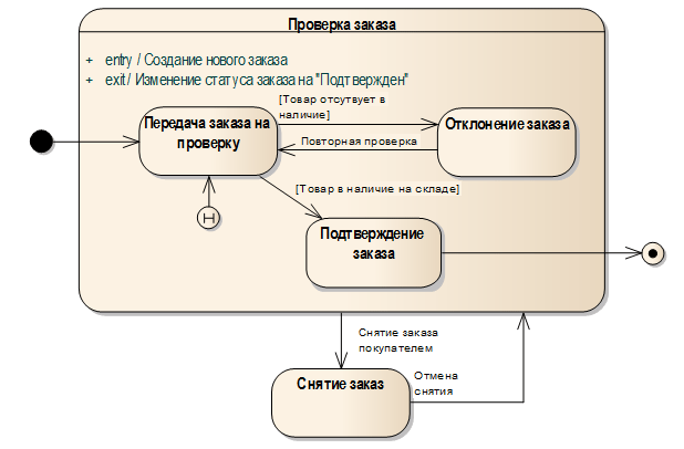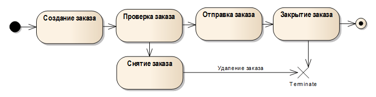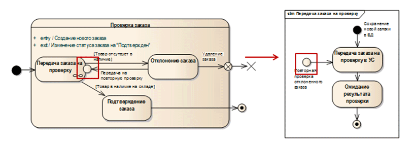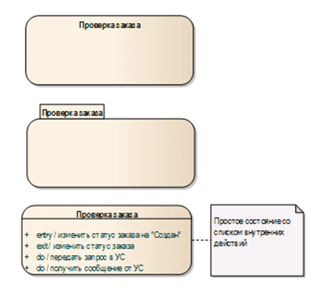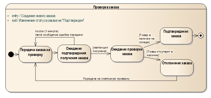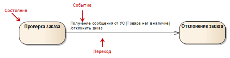 Также зачастую диаграмма состояний используется аналитиками для описания последовательности переходов объекта из одного состояния в другое. Диаграмма состояний покажет нам все возможные состояния, в которых может находиться объект, а также процесс смены состояний в результате внешнего влияния. Основными элементами диаграммы состояний являются «Состояние» и «Переход». Диаграмма состояний имеет схожую семантику с диаграммой деятельности, только деятельность здесь заменена состоянием, переходы символизируют действия. Таким образом, если для диаграммы деятельности отличие между понятиями «Деятельность» и «Действие» заключается в возможности дальнейшей декомпозиции, то на диаграмме состояний деятельность символизирует состояние, в котором объект находится продолжительное количество времени, в то время как действие моментально.