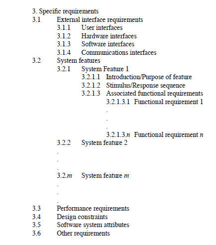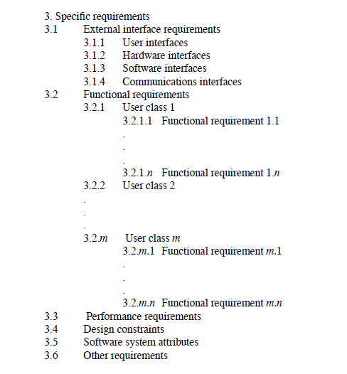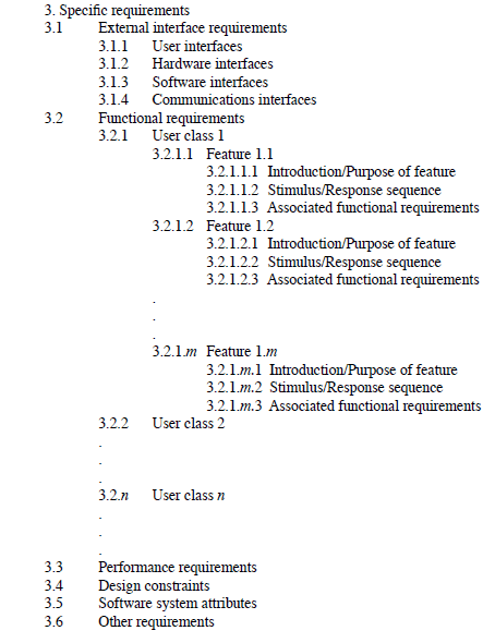 Figure 1ÑPrototype SRS outline 5.1 Introduction (Section 1 of the SRS) The introduction of the SRS should provide an overview of the entire SRS. It should contain the following subsections: a) Purpose; b) Scope; c) DeÞnitions, acronyms, and abbreviations; d) References; e) Overview. 5.1.1 Purpose (1.1 of the SRS) This subsection should a) Delineate the purpose of the SRS; b) Specify the intended audience for the SRS. 5.1.2 Scope (1.2 of the SRS) This subsection should a) Identify the software product(s) to be produced by name (e.g., Host DBMS, Report Generator, etc.); b) Explain what the software product(s) will, and, if necessary, will not do; c) Describe the application of the software being speciÞed, including relevant beneÞts, objectives, and goals; d) Be consistent with similar statements in higher-level speciÞcations (e.g., the system requirements speciÞcation), if they exist. 5.1.3 DeÞnitions, acronyms, and abbreviations (1.3 of the SRS) This subsection should provide the deÞnitions of all terms, acronyms, and abbreviations required to properly interpret the SRS. This information may be provided by reference to one or more appendixes in the SRS or by reference to other documents. 5.1.4 References (1.4 of the SRS) This subsection should a) Provide a complete list of all documents referenced elsewhere in the SRS; b) Identify each document by title, report number (if applicable), date, and publishing organization; c) Specify the sources from which the references can be obtained. This information may be provided by reference to an appendix or to another document. 5.1.5 Overview (1.5 of the SRS) This subsection should a) Describe what the rest of the SRS contains; b) Explain how the SRS is organized. 5.2 Overall description (Section 2 of the SRS) This section of the SRS should describe the general factors that affect the product and its requirements. This section does not state speciÞc requirements. Instead, it provides a background for those requirements, which are deÞned in detail in Section 3 of the SRS, and makes them easier to understand. This section usually consists of six subsections, as follows: a) Product perspective; b) Product functions; c) User characteristics; d) Constraints; e) Assumptions and dependencies; f) Apportioning of requirements. 5.2.1 Product perspective (2.1 of the SRS) This subsection of the SRS should put the product into perspective with other related products. If the product is independent and totally self-contained, it should be so stated here. If the SRS deÞnes a product that is a component of a larger system, as frequently occurs, then this subsection should relate the requirements of that larger system to functionality of the software and should identify interfaces between that system and the software. A block diagram showing the major components of the larger system, interconnections, and external interfaces can be helpful. This subsection should also describe how the software operates inside various constraints. For example, these constraints could include a) System interfaces; b) User interfaces; c) Hardware interfaces; d) Software interfaces; e) Communications interfaces; f) Memory; g) Operations; h) Site adaptation requirements. 5.2.1.1 System interfaces This should list each system interface and identify the functionality of the software to accomplish the system requirement and the interface description to match the system. 5.2.1.2 User interfaces This should specify the following: a) The logical characteristics of each interface between the software product and its users. This includes those conÞguration characteristics (e.g., required screen formats, page or window layouts, content of any reports or menus, or availability of programmable function keys) necessary to accomplish the software requirements. b) All the aspects of optimizing the interface with the person who must use the system. This may simply comprise a list of doÕs and donÕts on how the system will appear to the user. One example may be a requirement for the option of long or short error messages. Like all others, these requirements should be veriÞable, e.g., Òa clerk typist grade 4 can do function X in Z min after 1 h of trainingÓ rather than Òa typist can do function X. Ó (This may also be speciÞed in the Software System Attributes under a section titled Ease of Use.) 5.2.1.3 Hardware interfaces This should specify the logical characteristics of each interface between the software product and the hardware components of the system. This includes conÞguration characteristics (number of ports, instruction sets, etc.). It also covers such matters as what devices are to be supported, how they are to be supported, and protocols. For example, terminal support may specify full-screen support as opposed to line-by-line support. 5.2.1.4 Software interfaces This should specify the use of other required software products (e.g., a data management system, an operating system, or a mathematical package), and interfaces with other application systems (e.g., the linkage between an accounts receivable system and a general ledger system). For each required software product, the following should be provided: Ñ Name; Ñ Mnemonic; Ñ SpeciÞcation number; Ñ Version number; Ñ Source. For each interface, the following should be provided: Ñ Discussion of the purpose of the interfacing software as related to this software product. Ñ DeÞnition of the interface in terms of message content and format. It is not necessary to detail any well-documented interface, but a reference to the document deÞning the interface is required. 5.2.1.5 Communications interfaces This should specify the various interfaces to communications such as local network protocols, etc. 5.2.1.6 Memory constraints This should specify any applicable characteristics and limits on primary and secondary memory. 5.2.1.7 Operations This should specify the normal and special operations required by the user such as a)