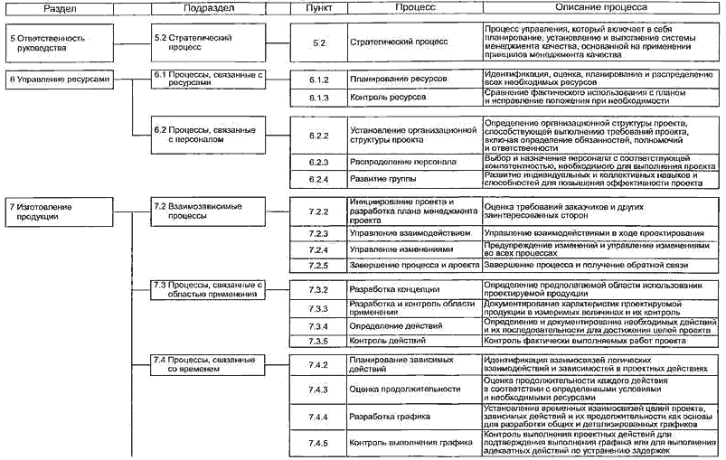 Стратегический процесс, описанный в разделе 5 , устанавливает направление проектирования. Раздел 6 описывает процессы, связанные с ресурсами и персоналом. Раздел 7 охватывает процессы, связанные с взаимозависимостью, областью применения, временем, стоимостью, обменом информацией, риском и закупками. Процессы, связанные с измерением, анализом и постоянным улучшением, описаны в разделе 8 . Эти разделы содержат описание каждого процесса и обеспечивают руководство по менеджменту качества процессов.